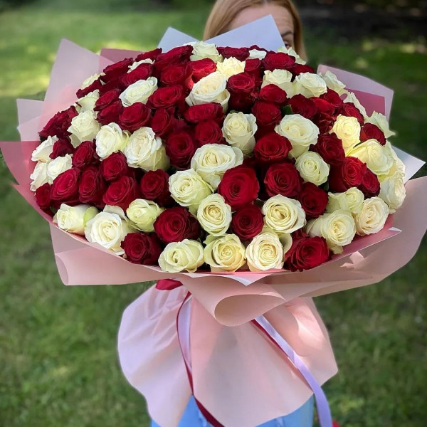 Головна / Квіти / Троянди / Червоні троянди / Букет із 101 червоної та білої троянди