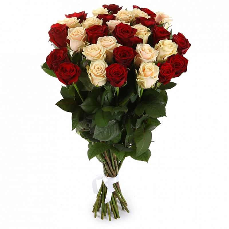 Головна / Квіти / Троянди / Червоні троянди / Букет з 21 червоної та кремової троянди «Контраст почуттів»