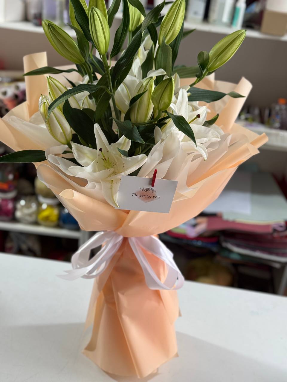 Головна / Квіти / Квіти / Лілії / Букет із 5 гілок білої лілії