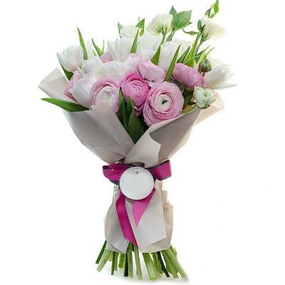 Букет із ранункулюсiв, еустоми та тюльпанів