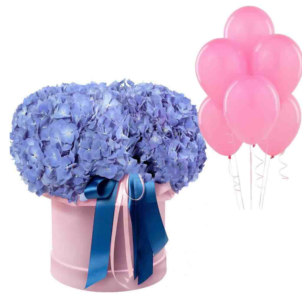 Головна / Квіти / Композиції / Квіти в коробці / Композиція в коробці із 3 синіх гортензій та гелевих кульок