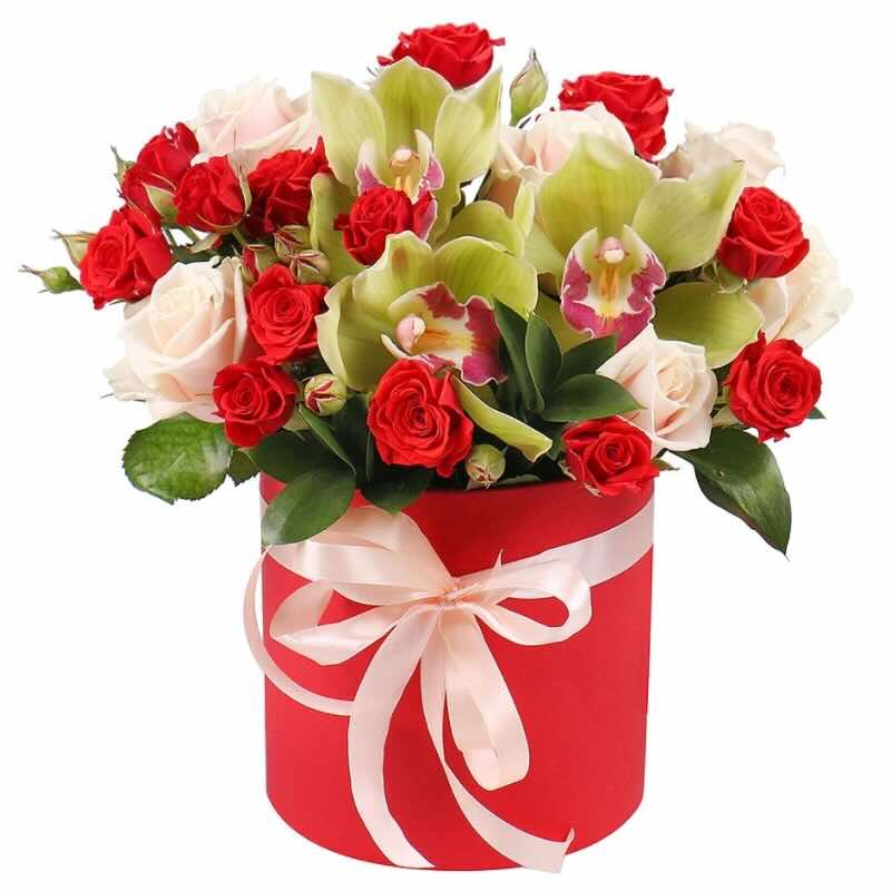 Композиція в коробці з троянд та орхідеї “Аромат почуттів”