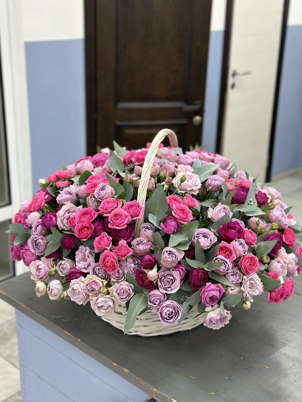Головна / Квіти / Преміум букети / Кошик із 49 кущової півонієподібної троянди