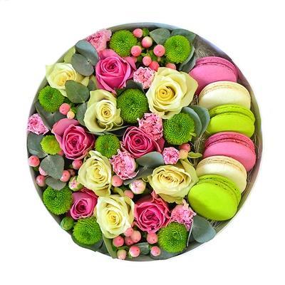 Головна / Квіти / Композиції / Квіти в коробці / Квіти в коробці з макарунами «Квітковий десерт»