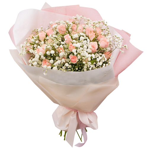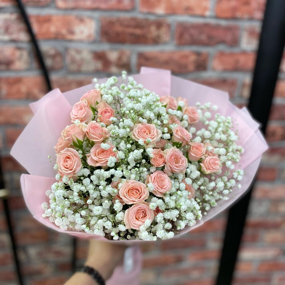 Букет із кущової троянди та гіпсофіли