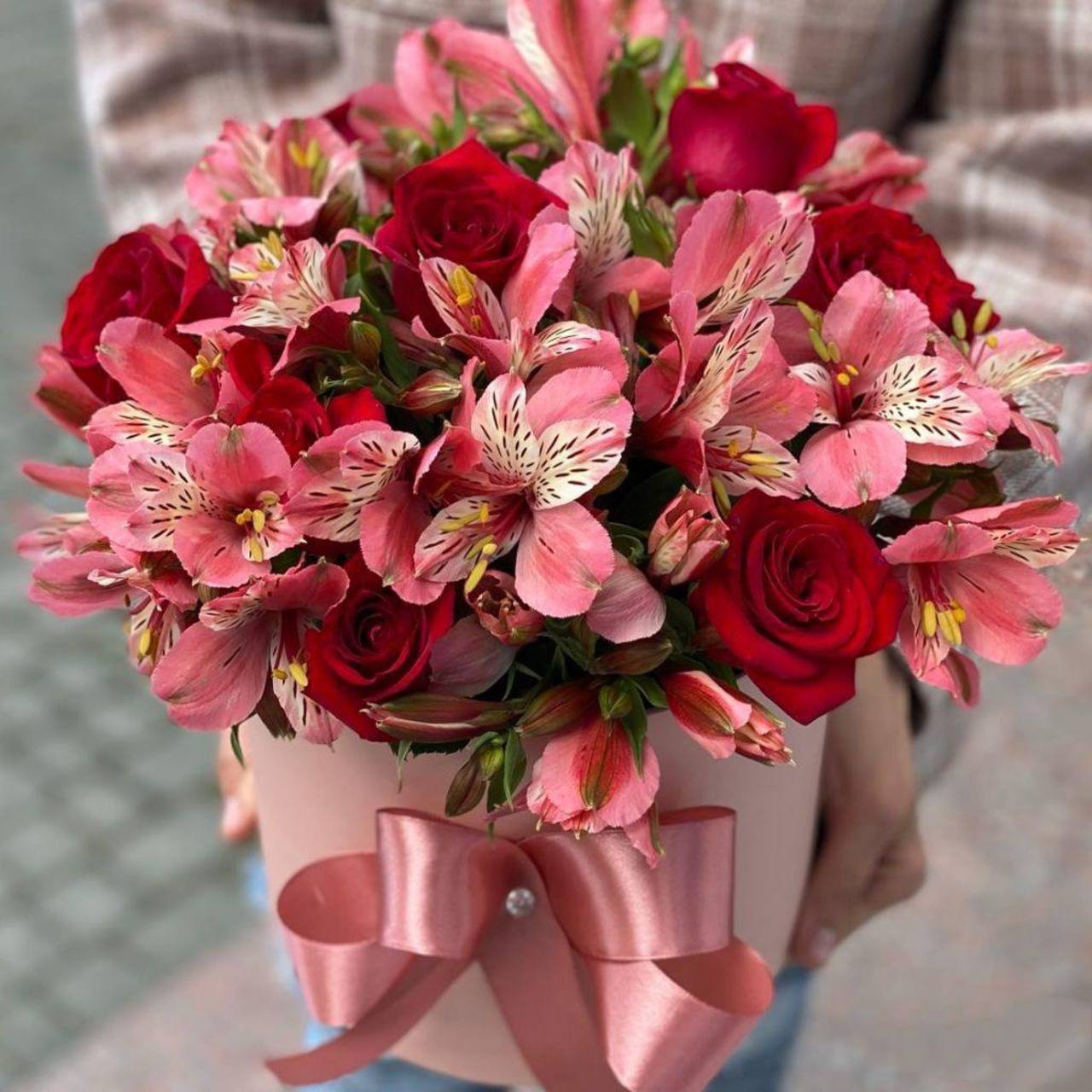 Композиція в коробці із трояндами та альстромерією