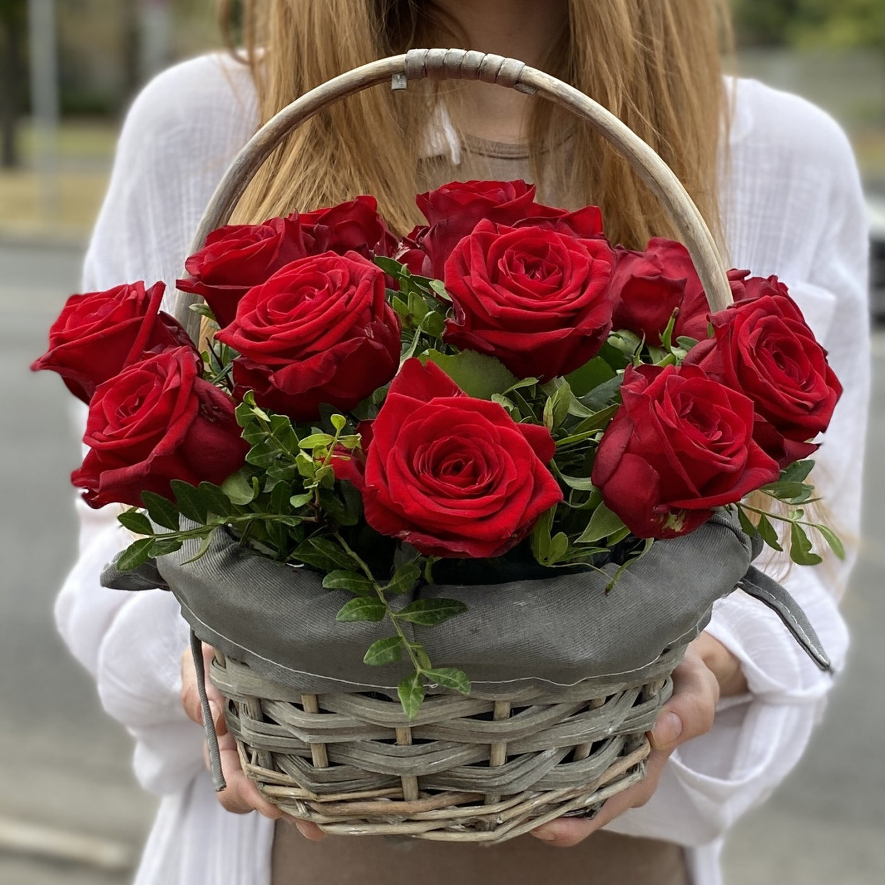 Головна / Квіти / Композиції / Квіти в кошику / Кошик із 11 червоних троянд