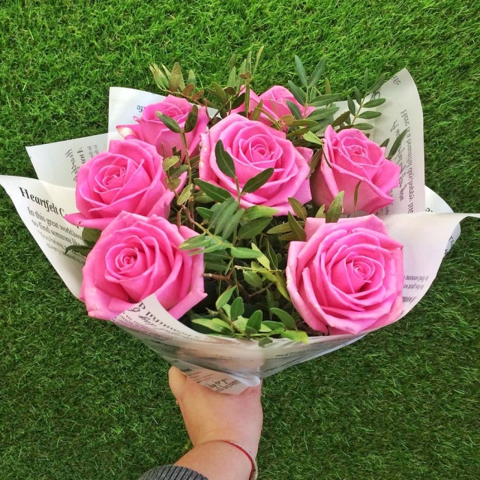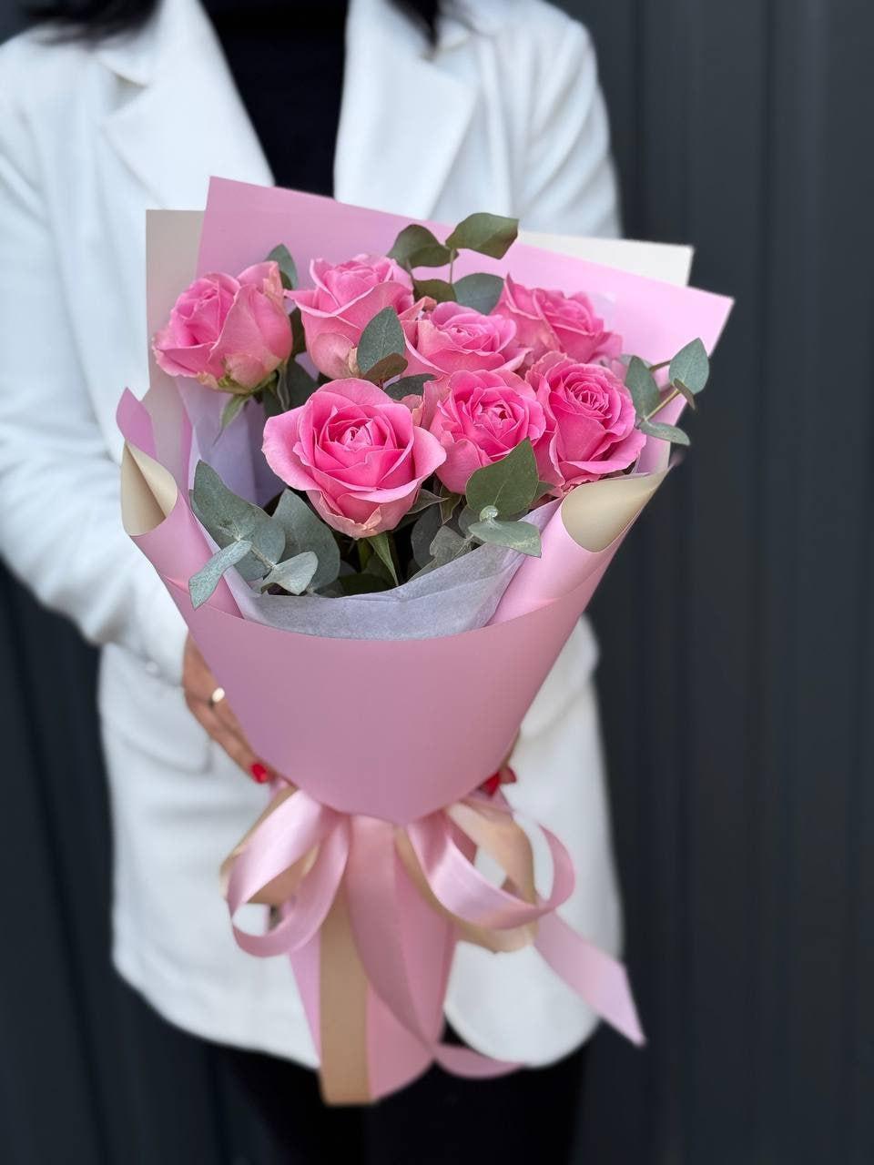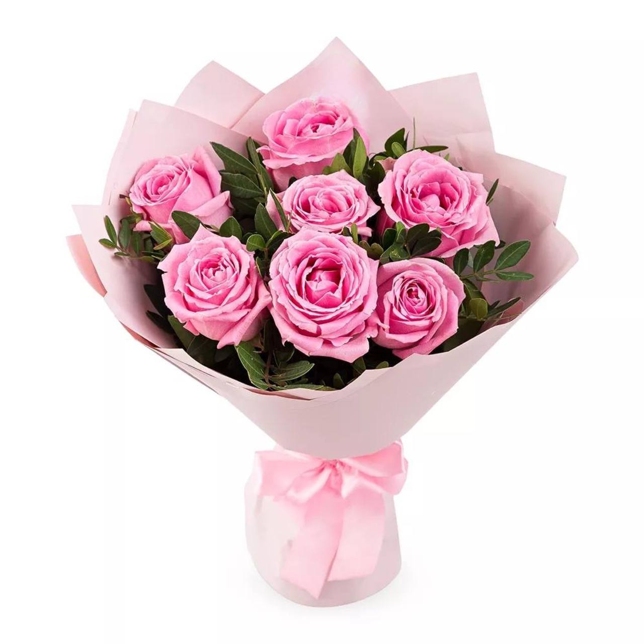 Головна / Квіти / Троянди / Рожеві троянди / Букет із 7 рожевих троянд «Жаклін»